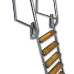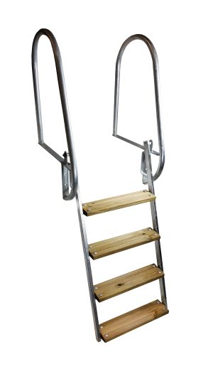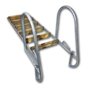 Badstege i varmgalvaniserat stål med 4 st breda steg i trä. Bredden på trappstegen är 12 cm.